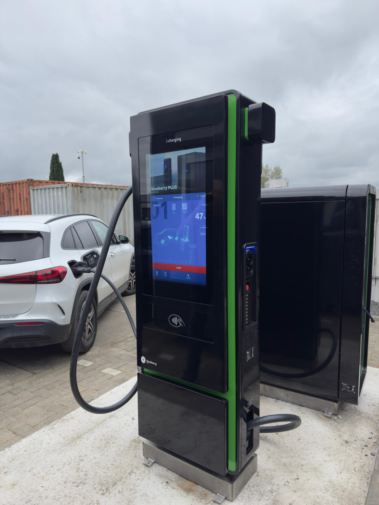 Voor deze klant hebben we een toekomstbestendige laadoplossing gerealiseerd die niet alleen geschikt is voor de eigen elektrische voertuigen, maar ook voorbereid is op het laden van elektrische trucks van de buurman in de toekomst. Het hart van deze installatie? Een krachtige I-Charging BlueBerry PLUS snellader van 200 kW, afkomstig van Europese bodem.